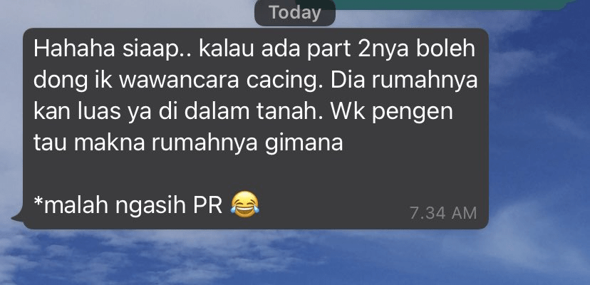 Mendengar Siput bercerita tentang perspektif rumah, ada rasa haru mendalam yang tergambar dari matanya yang berkaca-kaca dan suaranya yang parau. “Rumah itu selalu berhasil memberi sense of existing ke aku. Istilahnya ‘aku di rumah, maka aku ada’. Aku kan memang bisa mati kalau tidak ada rumah. Mati secara harfiah, gone.” Siput tertawa penuh getir. “Tapi aku nggak sedih, karena itu berarti rumah selalu bisa jadi pengingat yang indah bahwa hidup di dunia itu kesementaraan. Aku sering dibilang lambat lah, lemot lah, padahal yang aku lakukan itu ya menikmati setiap momen, memaknai semua-semua yang aku lakukan karena disini cuma sementara. Jadi setiap tempat yang ada jejak kita itu, kita ingat. Walau nanti sudah hidup di dimensi yang lain.” Begitulah kira-kira rangkuman dari percakapan rumah ke rumah. Kita semua seringkali sibuk mencari dimana rumah, siapa yang menjadi rumah. Padahal justru mungkin, kita hanya perlu pulang ke dalam diri.