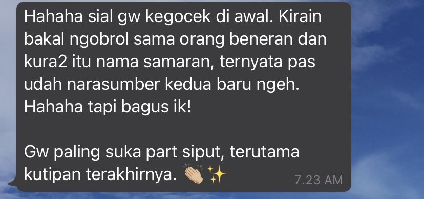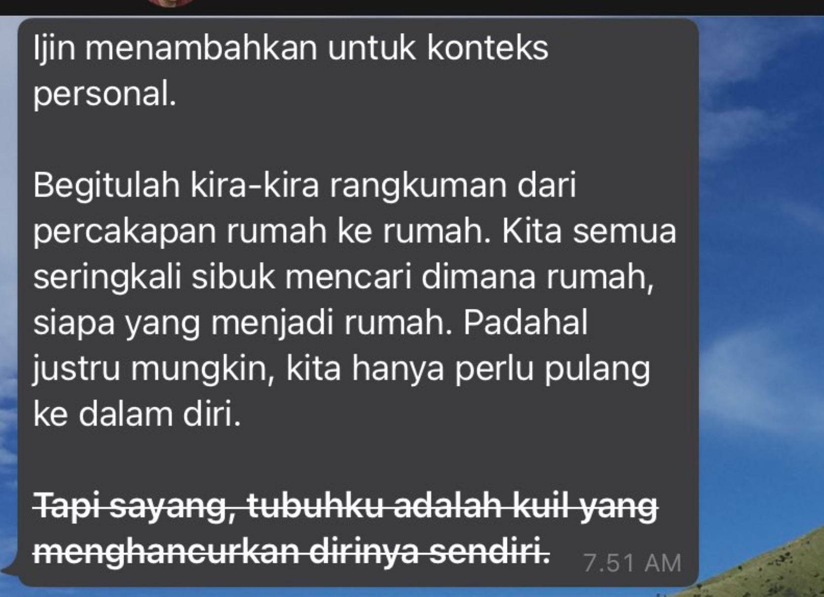 Mendengar Siput bercerita tentang perspektif rumah, ada rasa haru mendalam yang tergambar dari matanya yang berkaca-kaca dan suaranya yang parau. “Rumah itu selalu berhasil memberi sense of existing ke aku. Istilahnya ‘aku di rumah, maka aku ada’. Aku kan memang bisa mati kalau tidak ada rumah. Mati secara harfiah, gone.” Siput tertawa penuh getir. “Tapi aku nggak sedih, karena itu berarti rumah selalu bisa jadi pengingat yang indah bahwa hidup di dunia itu kesementaraan. Aku sering dibilang lambat lah, lemot lah, padahal yang aku lakukan itu ya menikmati setiap momen, memaknai semua-semua yang aku lakukan karena disini cuma sementara. Jadi setiap tempat yang ada jejak kita itu, kita ingat. Walau nanti sudah hidup di dimensi yang lain.” Begitulah kira-kira rangkuman dari percakapan rumah ke rumah. Kita semua seringkali sibuk mencari dimana rumah, siapa yang menjadi rumah. Padahal justru mungkin, kita hanya perlu pulang ke dalam diri.